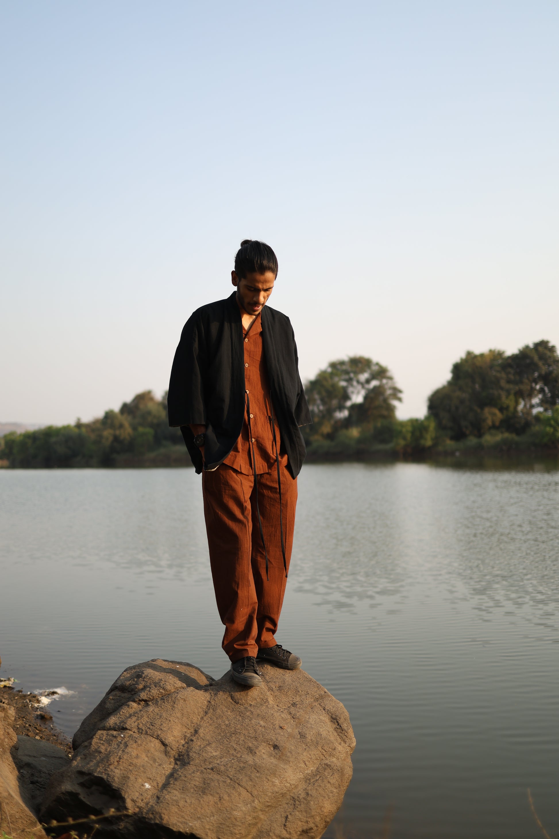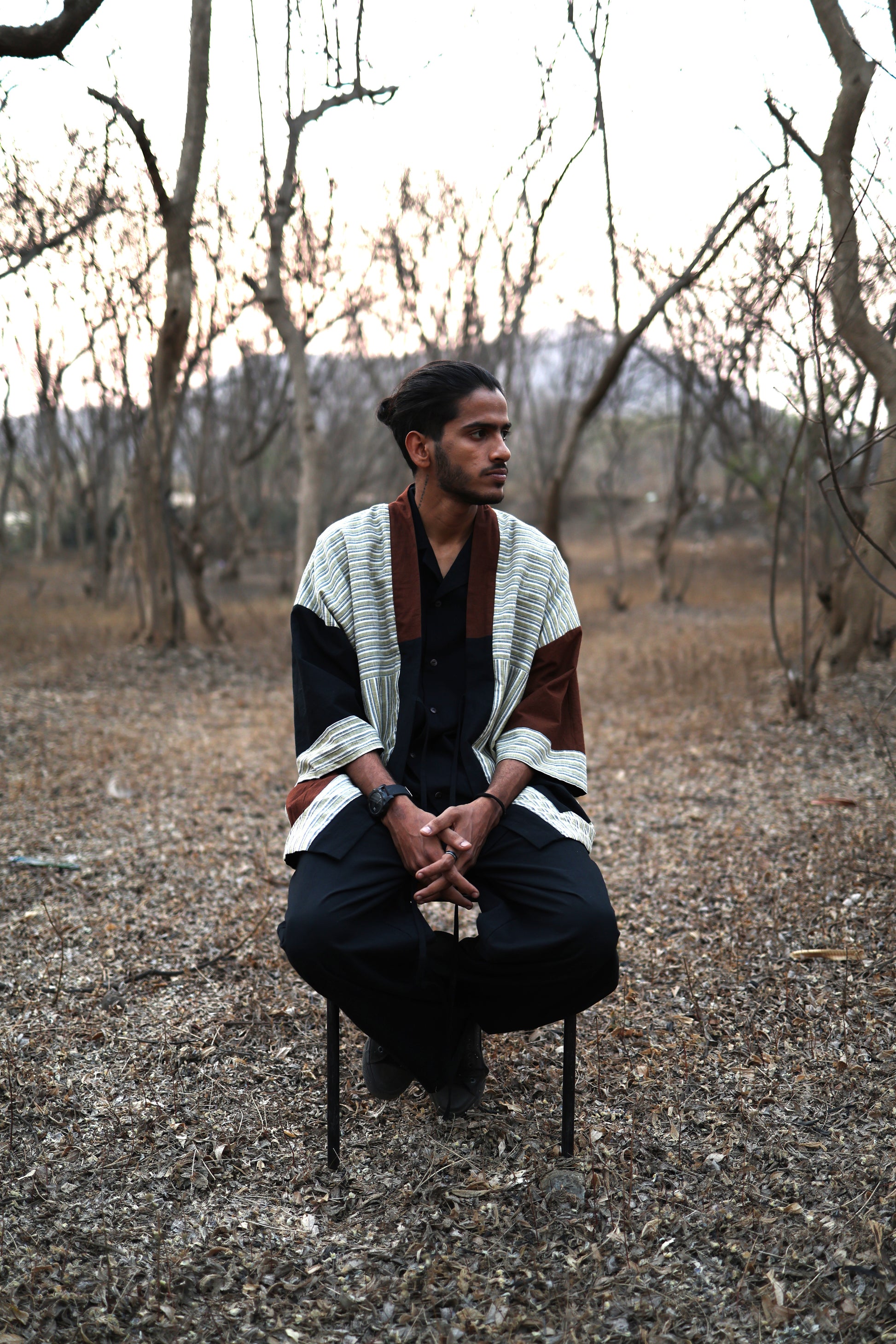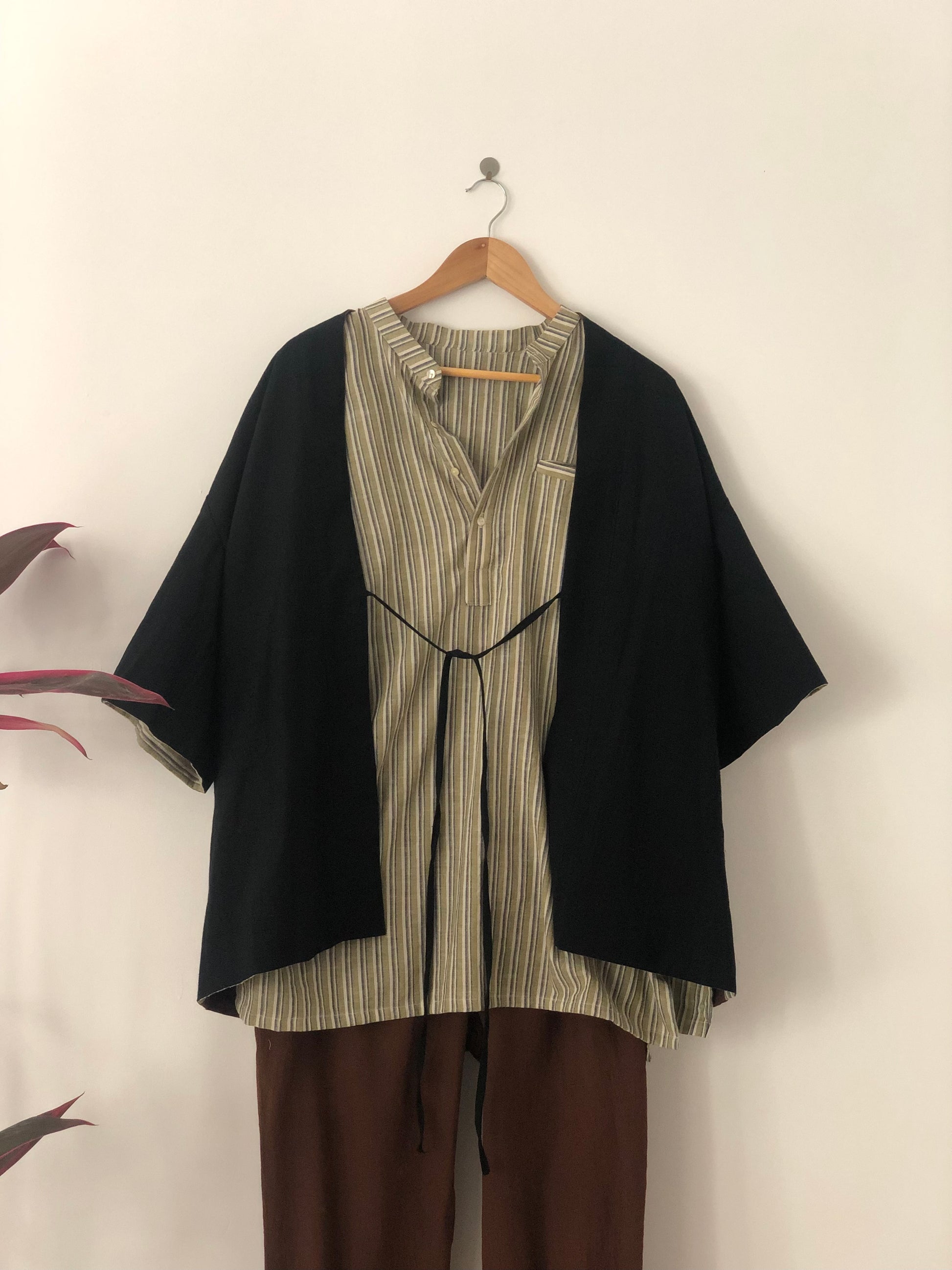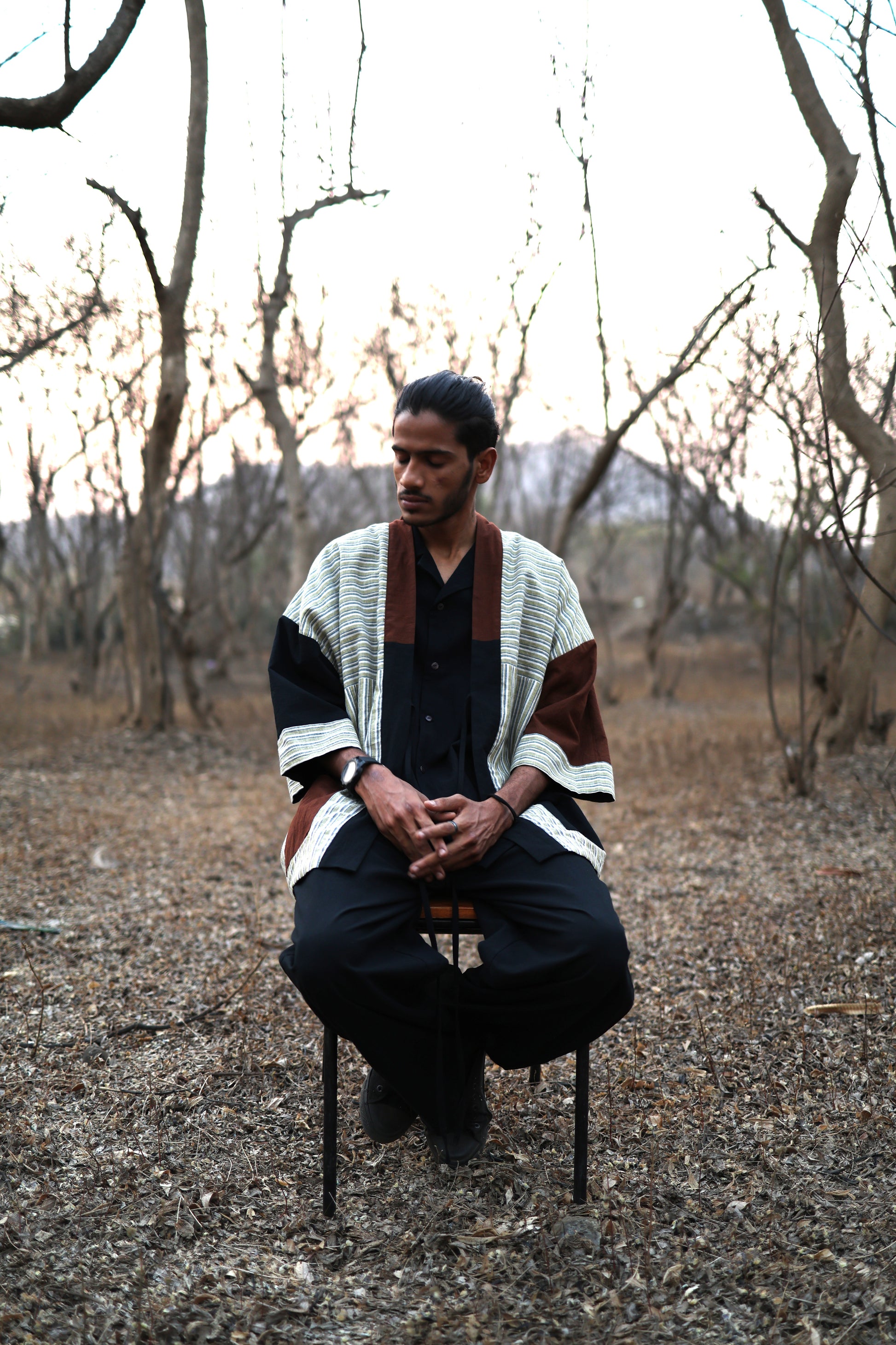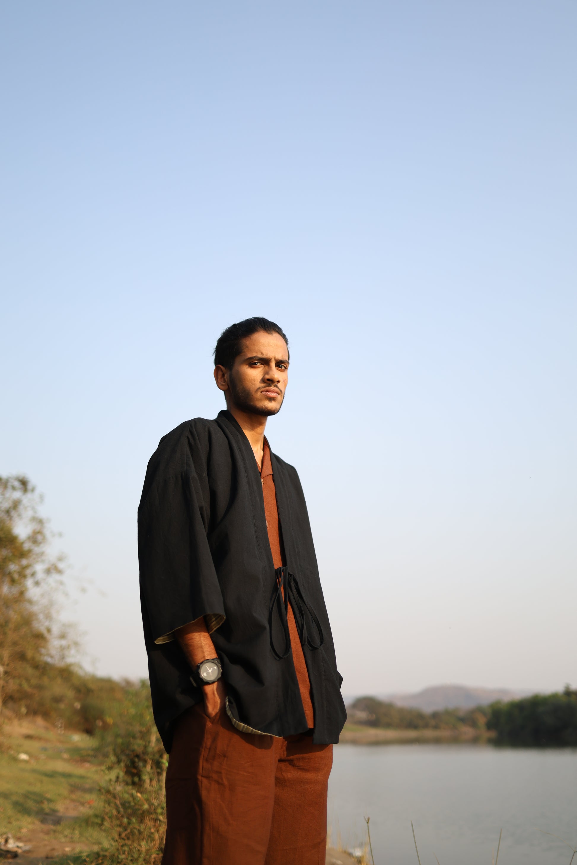 An excellent reversible fall throw-over in an uplifting black, brown and olive green hue that can be layered on dress, shirts or sweaters on brisk evenings. It is tailored using mid-weight hand spun cotton fabric that has been has been patched together on one side and is plain black on other. Long sleeves and a shawl collar highlight your everyday style while providing the highest level of comfort.