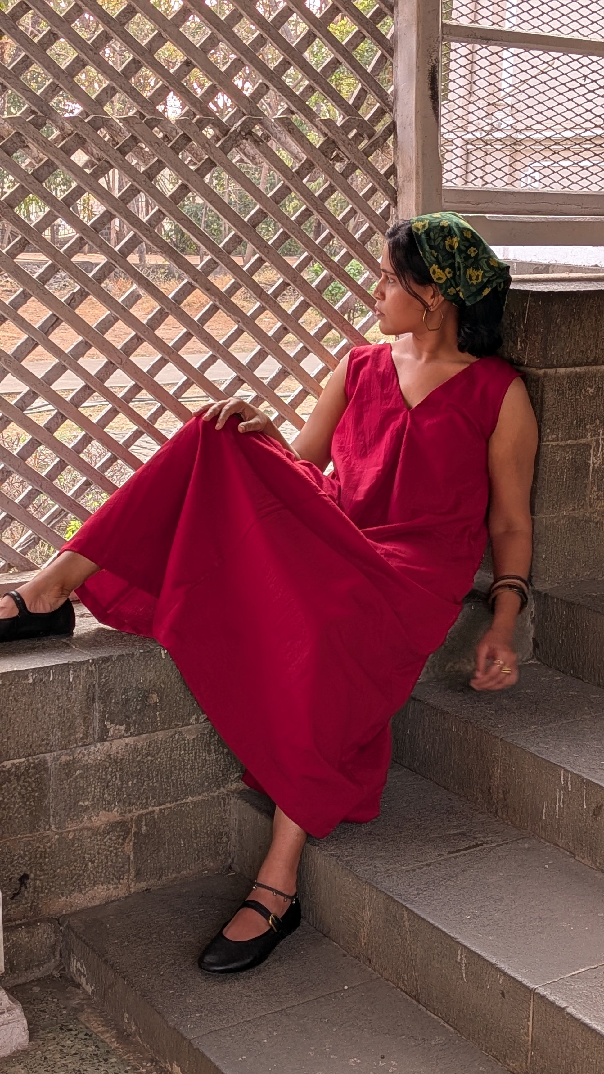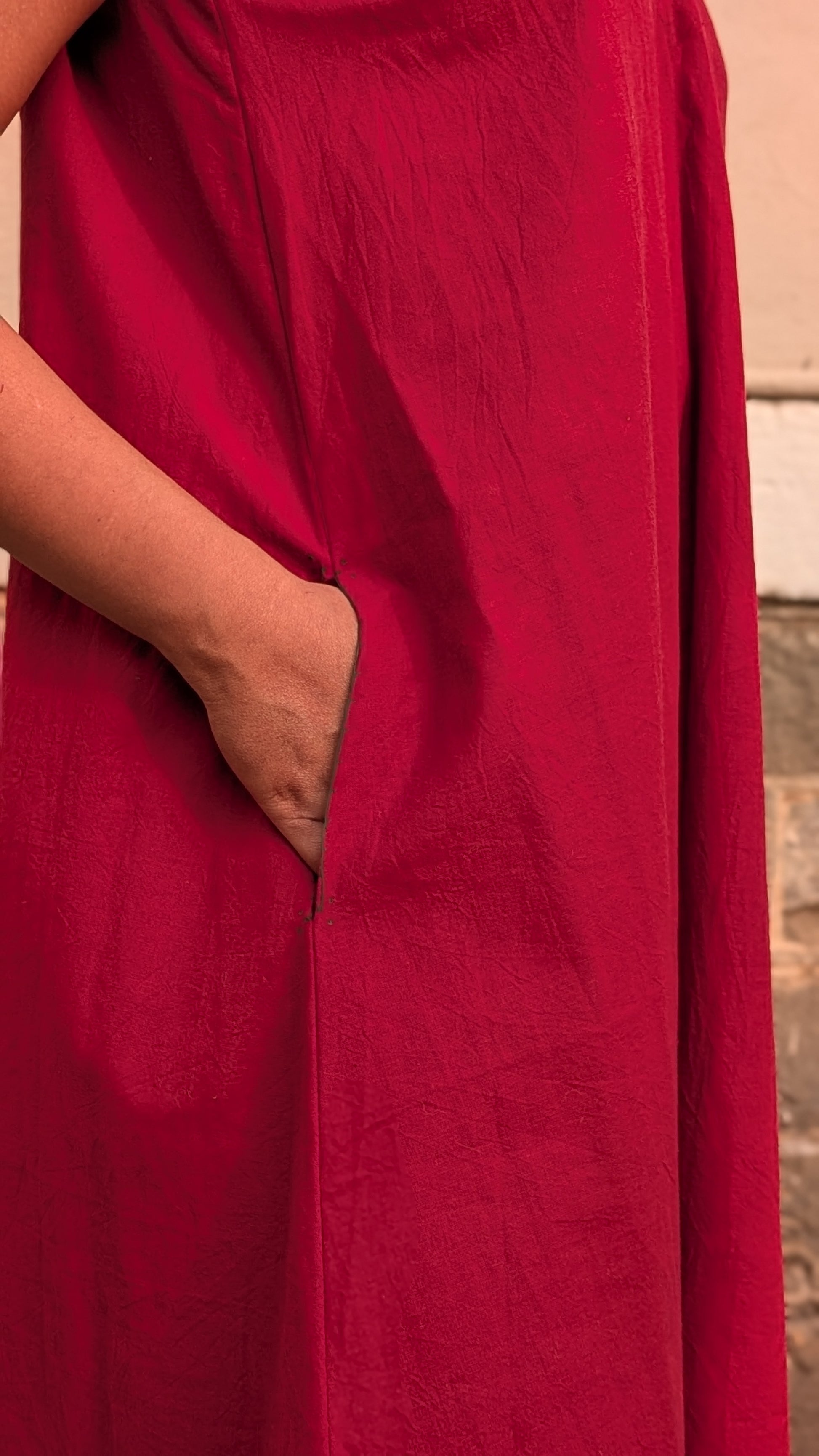 The voluminous solid red color dress is tailored in a roomy and sophisticated flare, A simple A-line ankle length dress, V-shaped neck line, side pockets highlighted with hand stitch lines for functionality. This piece would work beautifully for transition weather and semi-formal looks.